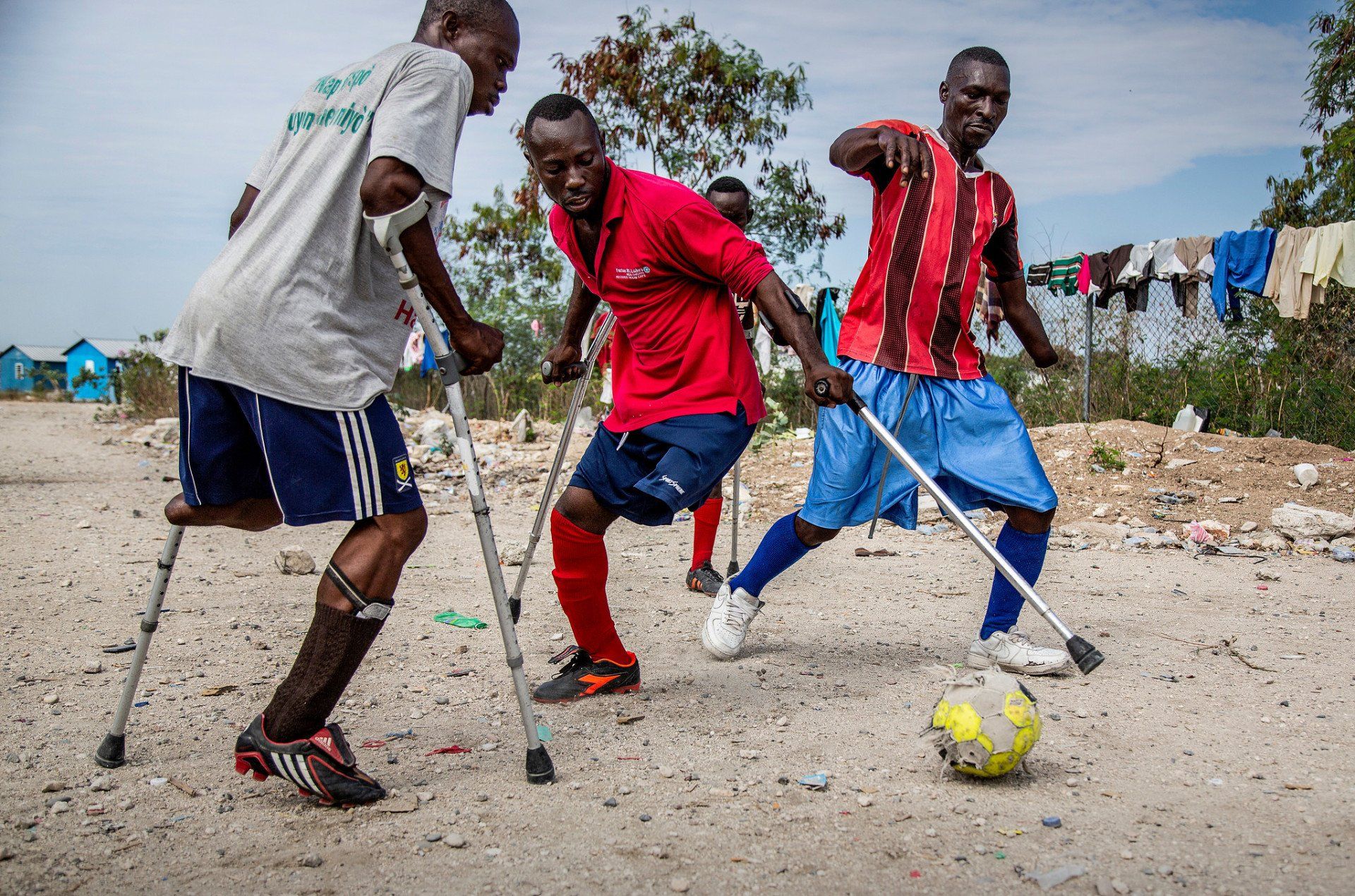 Description: Haitian men with disabilities from the 2010 earthquake practice soccer together.