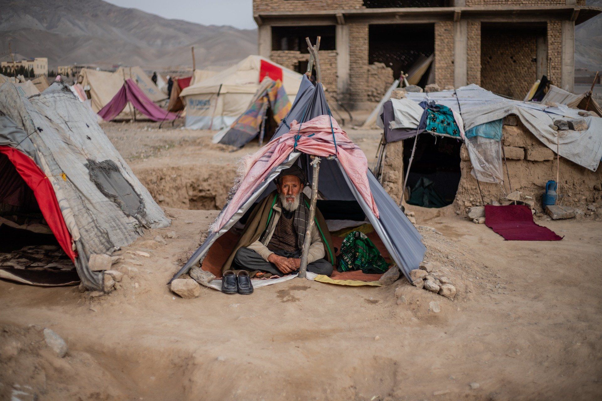 Description: ”Last week my wife died due to cardiac arrest and the following week we started dismantling our house when we heard the Ganges started eroding the land again.” - Nurul Islam, 80 years old -pictured in chair