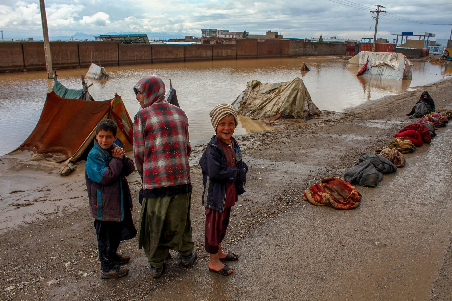 Description: ”School girls stand in an abandoned seaport town next to an installation showing where the Aral Sea used to come."
